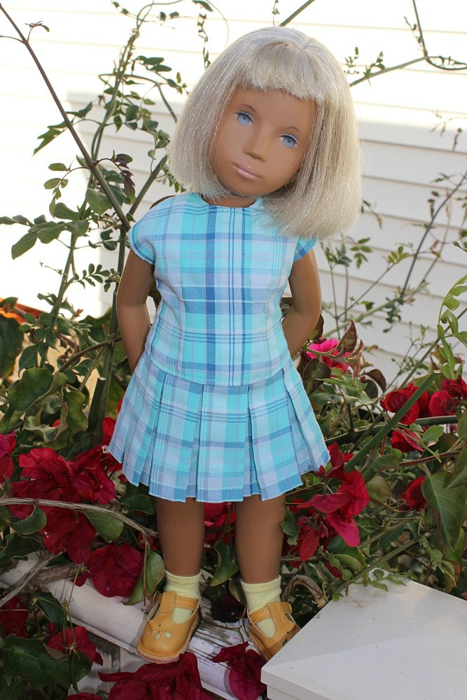 Now we have another little sweetie, Skye. Skye would be described as a 'waif' as I cut the length of her hair into this bob as the ends were very dry. She is from 1969. She's wearing an aqua check dress that I made, along with her socks, and this time, her lovely mustard yellow shoes are from Marti Sanders Murphy in the US. They were a very kind Christmas gift to me from a dear Sasha friend :)
